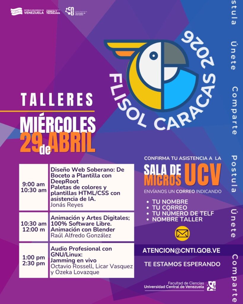 La agenda del festival para este año se dividirá en dos jornadas de alto impacto formativo en la ciudad de Caracas. El miércoles 29 de abril, la Facultad de Ciencias de la Universidad Central de Venezuela (UCV) recibirá las mesas de instalación y los talleres prácticos en su Sala de Micros. En este espacio, el público podrá participar en formaciones especializadas como la de Diseño Web Soberano con DeepRoot para la creación de plantillas con asistencia de Inteligencia Artificial (IA), así como talleres de Animación y Artes Digitales utilizando Blender y sesiones de Audio Profesional bajo GNU/Linux.