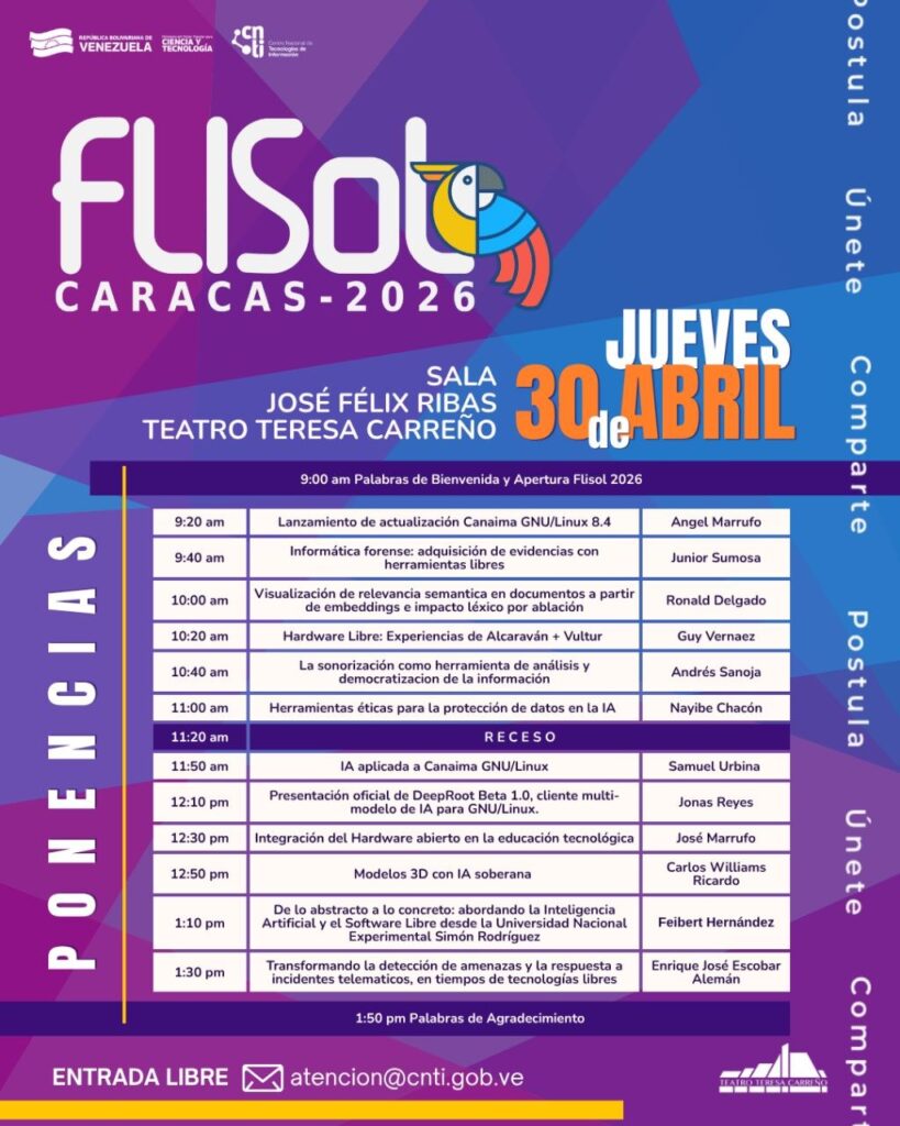 El cierre del evento tendrá lugar el jueves 30 de abril en la Sala José Félix Ribas del Teatro Teresa Carreño. En este espacio se desarrollará un ciclo de doce charlas magistrales que estarán orientadas al lema central de esta edición, el cual se enfoca en la Inteligencia Artificial aplicada al Software Libre. Entre las ponencias destacan el lanzamiento oficial de DeepRoot Beta 1.0 como cliente multi-modelo de IA, la adquisición de evidencias en informática forense con herramientas libres y el análisis de la sonorización como herramienta de democratización de la información. De igual forma, se abordarán temas de hardware libre con las experiencias de Alcaraván-Vultur, junto con el uso de herramientas éticas para la protección de datos, lo que reafirma a Canaima GNU/Linux como una plataforma integral al servicio de los venezolanos.