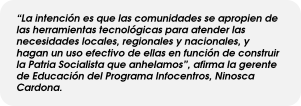 Para el Gobierno Bolivariano en la construcción de la Nueva Patria Socialista el poder lo tiene el Pueblo, y según refiere la gerente de Educación del Programa Infocentros, Ninosca Cardona: “Mientras más acceso al conocimiento tiene un pueblo menos posibilidades de imponer formas de vida y decidir nuestros destinos tienen gobiernos e intereses foráneos. Este Gobierno promueve la educación y formación de venezolanas y venezolanos para garantizar el desarrollo de la capacidad nacional, el progreso de nuestra Nación y el ejercicio de la Soberanía”.